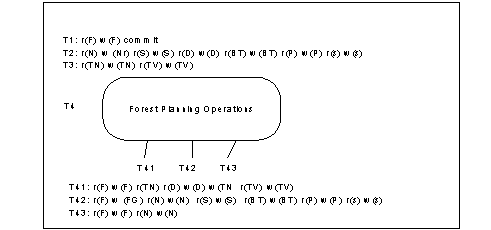 This plan, T2, determines the data set required for the needs of practicing selective management system of the Forest Stand. Problem (b) involve more deliberation. The place to implement it is at the agent Reasoning Layer, where the agent tries to fulfill more complicated goals. Usually, the user will observe the required management options and must be coordinated with getting the necessary variables from the existing FR. So, at this layer, the agent watches the type of expertise to get involved. When a good deal is observed by the situation recognition module, the goal "selection of management options" is activated and a DT is executed by initiating the root problem T3 at the deliberative layer to decide the necessary assignments. This root problem creates three sub-problems at the lower level: T31, T32, and T33. T31 updates the F (T31 is of the same type as T1). For example, T32 allocates the list of silviculture treatments by triggering the number of trees according to their conditions (i) diameter class >45cm, number of trees ≥ 25, number of Dominance trees ≥25, number of vine free trees ≥25, (ii) diameter class +30 - 45cm, number of trees ≥32, number of Dominance trees ≥32, number of no-climber trees ≥32, (iii) ) diameter class +15 - 30cm, number of trees ≥ 100, number of Dominance trees ≥100, number of no-climber trees ≥100. T33 waits until the release of the lock on the FR to make the final decision. Under the DT these sub-problems (T31, T32, and T33) can run concurrently with each other or with other problems. All the designer has to do is to define the appropriate behavior in case of failure of these problems according to the rules mentioned in Section 4.0 (e.g defining compensation node). Then, it is up to the database infrastructure to learn and execute these DT, resolve possible conflicts, and handle exceptions resulting from the failure of one the sub-problems. Figure 5.2 shows a semantically concurrent execution of these DT, expressed as a partial order between them. The graph proceeds from left to right and the edges mark the order between conflicting pairs of sub-problems.
