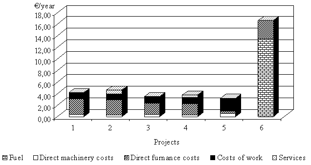 The greatest differences between the projects occur due to the required investments for machinery (projects No. 1 and No. 3) and furnaces (all projects). Investments for modern wood chips furnaces are six times greater than investment for an outdated log furnace, and five times greater than investment for a modern heating oil furnace. Such great differences can be reduced only with an appropriate subsidy system and very attractive credits.