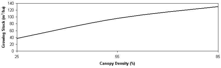 Low growing stock: FAO estimates 73 t/ha of woody biomass in natural forests in India, low as compared to 82 and 109 t/ha in tropical Asia and World respectively.7 Calculation of biomass densities for various forest types/strata for 1995 for canopy densities of >70%, 40-70% and 10-40% indicate that forest with canopy density of 40-70% and 10-40% show average growing stock as 74.1% and 28.2% respectively, of the growing stock with canopy density of more than 70% (Fig II).10 This shows that forest degradation lowers growing stock significantly and is important in any forest management strategy.