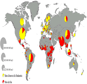 Si à l'échelle du monde, environ la moitié de la production est utilisée pour produire de l'énergie, et l'autre moitié pour du bois d'œuvre ou d'industrie, la répartition de ces usages est en revanche très différente selon les pays (figure 1).