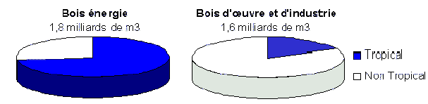 De façon parallèle, moins de 30 % des bois non tropicaux sont utilisés pour l'énergie, alors que cet usage concerne plus de 80 % (soit 1,3 milliard de m3) du volume des bois tropicaux. En d'autres termes, les tropiques fournissent plus de 70 % du bois d'énergie mondial, et moins de 20 % (soit 280 millions de m3) du bois d'œuvre et d'industrie (figure 2).