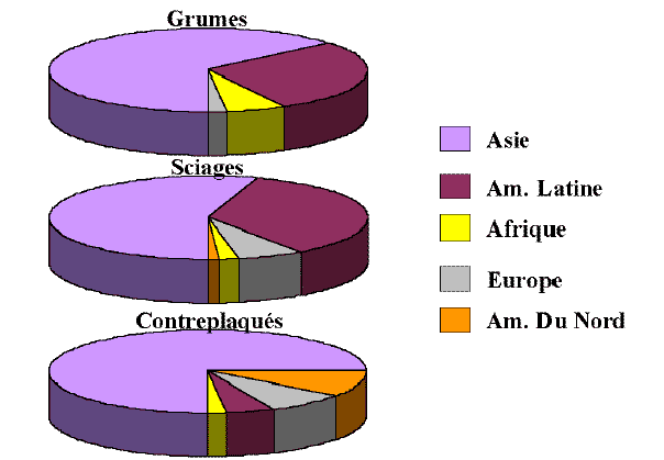 Figure 3: Part de la consommation des principaux produits forestiers tropicaux, par continent (Roda, 2002)