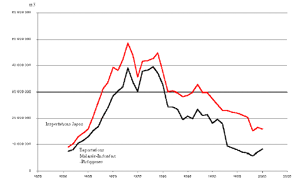 Autrefois, le commerce des bois tropicaux correspondait au schéma de l'importation par les pays industrialisés de produits primaires venant du reste du monde. Cela n'est plus vrai à présent en raison de la concurrence mondiale des bassins de main d'œuvre et du poids croissant des pays en développement dans l'offre et la demande des biens manufacturés. C'est dans cette catégorie de pays que comptent désormais les premiers exportateurs de produits de seconde transformation à base de bois tropicaux. Les flux qui aboutissaient auparavant essentiellement en Europe, se sont modifiés après la seconde guerre mondiale, avec la reprise économique de l'Asie Orientale. Le Japon a été à l'origine d'une forte croissance du commerce des bois, jusqu'à ce que ses importations culminent dans les années 1970 (en 1974, il représentait à lui seul 55 % des importations mondiales de grumes et de produits de première transformation). Jusqu'au début des années 1990 ce pays a été le moteur essentiel de la demande en bois tropicaux, tandis que la Malaisie, l'Indonésie, et les Philippines ont été les moteurs de l'offre (Figure 4). A partir de ce moment, la transformation, après avoir été essentiellement le fait du Japon et de la Corée, s'est alors relocalisée en Malaisie, Indonésie, et en Inde.