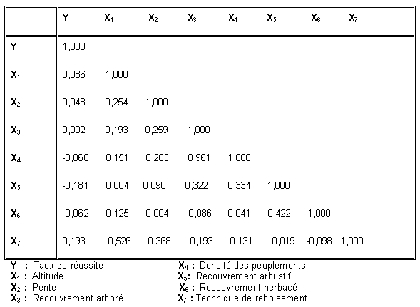 Il découle de cette matrice que les corrélations entre la variable endogène«Y» et les variables exogènes «X» sont faibles. Pour ce qui est du taux de réussite, objet fondamental de l'étude, les conclusions de la méthode analytique concordent parfaitement avec ces résultats. En particulier, le nombre de semis par placette dépend très faiblement de la profondeur du sable et de la pente du terrain.