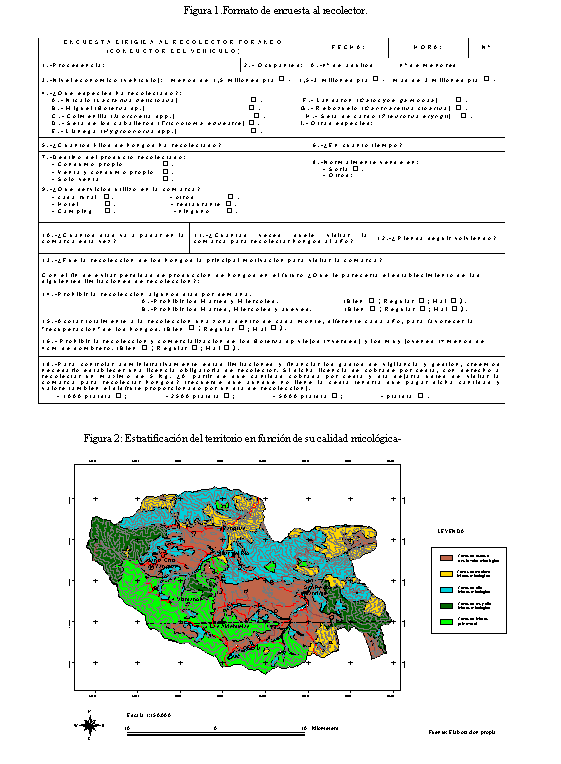 El inventario de recolectores consistió en registrar todos los vehículos estacionados en las pistas forestales del recorrido. Se especificó la procedencia, el punto kilométrico y categoría del vehículo. Posteriormente, mediante procedimientos estadísticos, se estimó el número y distribución de visitantes en cada zona de la comarca, entre semana y en fin de semana, y durante toda la campaña otoñal de 2001. Mediante formatos de encuesta (figura 1) se obtuvo información relativa a la recolección de setas en la comarca, invitando a todos los recolectores localizados a pie de monte a contestar una serie de preguntas. Se averiguaron los hábitos, rendimientos y opiniones acerca del estado micológico y de la puesta en práctica de medidas de ordenación. Además de la disposición a pagar para contribuir a financiar los gastos de vigilancia y gestión que dicha ordenación generaría.