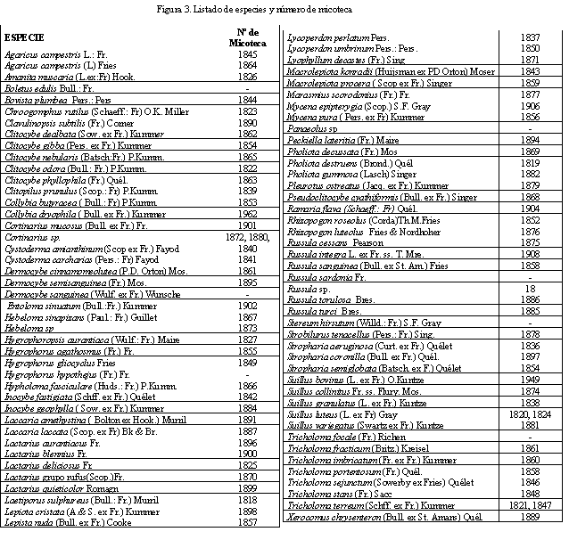 Se clasificó el territorio en unidades homogéneas de calidad micológica (figura 2), a partir de la información digital referente a la vegetación, naturaleza edáfica, clima, así como de los inventarios micológicos realizados en cada uno de los estratos considerados: Pinus sylvestris de origen natural en suelo ácido, Fagus sylvatica-Pinus sylvestris en suelo ácido, repoblación de Pinus sylvestris en terrazas de 30 años en suelo ácido, repoblación de Pinus sylvestris por hoyos de 40 años en suelo ácido, repoblación de Pinus nigra en terrazas en suelo básico seco, Quercus pyrenaica, repoblación de Pinus nigra en terrazas de suelo ácido, repoblación de Pinus sylvestris en terrazas con sotobosque de Quercus pyrenaica, repoblación de Pinus sylvestris en terrazas de 30 años en suelo ácido y húmedo, bosque de galería y pastizales de interés primaveral. La relación de especies inventariadas se resume en la figura 3 y se puede encontrar exsiccáta de cada especie en la Micoteca de Valonsadero.