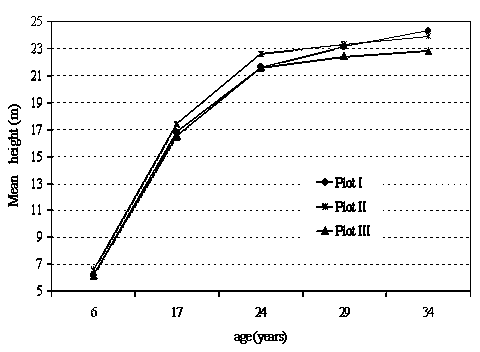 The following parameters were measured and calculated at the age if 6, 17, 24, 29 and 34 years: stem number, d.b.h., basal area, tree height, stem volume, stand volume and mean tree volume. Stem volume was estimated using the volume function (SOPP, 1974):