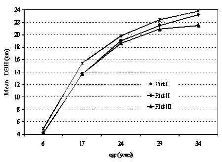 In spite of the difference in stem number between the plots regenerated from suckers sprouted from large and small roots, the DBH growth rates are similar, while the crop regenerated with seedlings produces the lowest DBH values after the age of 20 (Figure 2.).