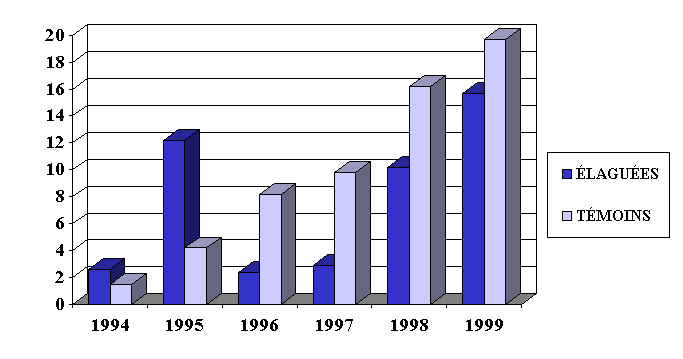 Les résultats dans les plantations saines indiquent que la maladie n'entre pas dans le peuplement après l'élagage. On peut donc supposer que la maladie entre dans la plantation par des semis infectés lors du reboisement; si tel est le cas, comme il est suggéré ailleurs (Laflamme et al. 1998b), il serait donc préférable de prévenir ce problème par des traitements appropriés en pépinière et par une certification phytosanitaire des semis avant la sortie des plants de la pépinière. Dans les plantations faiblement affectées, le taux n'a pratiquement pas changé avec ou sans traitement. Nous avons remarqué dans plusieurs plantations que la fermeture du couvert avait entraîné l'élagage naturel des branches basses. Dans le cas des plantations avec un taux élevé d'infection, la moyenne des résultats ne donne pas une image juste de la réalité. En fait, quatre des plantations ont été détruites par la maladie, deux ont été fortement endommagées et enfin les trois autres ont pu récupérer avec un taux acceptable de mortalité. La cause de ce demi-succès est, selon nous, la proportion de la cime enlevée. Nous avions fait la recommandation générale de n'élaguer que le tiers inférieur de la cime. En appliquant cette règle à tous les cas, le traitement était inefficace dans les plantations où la maladie avait déjà dépassé cette hauteur. C'est la raison pour laquelle nous avons modifié nos recommandations, lesquelles font présentement l'objet de validation.