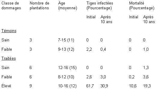 Nous présentons les résultats des évaluations de la maladie la première année avant l'élagage et 10 ans après l'élagage (tableau 1). Le taux de mortalité des arbres enregistré dans les plantations inclut les arbres moribonds coupés lors de l'opération d'élagage car ils étaient trop affectés par la maladie. Dans les trois plantations non-traitées mais très peu affectées par la maladie, il n'y a pas eu de progrès de la maladie, alors que dans les plantations élaguées, le taux d'infection est demeuré le même après 10 ans. Les plantations non-élaguées mais très sévèrement affectées ont été décimées par la maladie (données non-incluses dans le tableau). Parmi les plantations élaguées ayant une incidence initiale élevée de la maladie, quelques unes ont été complètement détruites alors que d'autres, avec un taux élevé d'arbres infectés, ont survécu malgré la mort de plusieurs arbres.