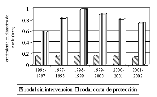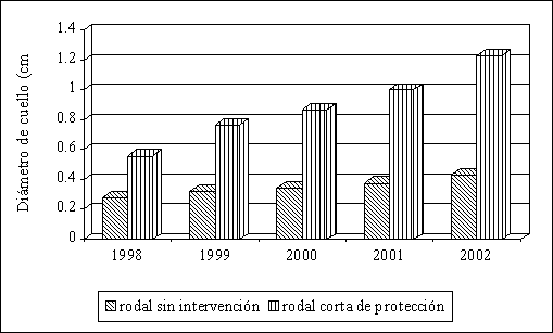 Fig. 4. Crecimiento en diámetro del cuello de la regeneración en de dos rodales de Nothofagus pumilio durante 1996-2002.