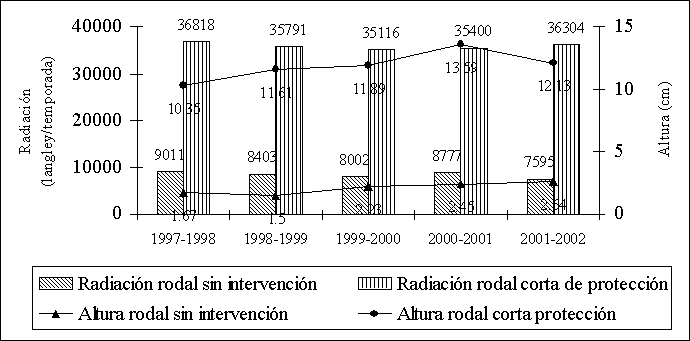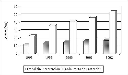 El estudio consideró dos rodales: un testigo, sin intervención, y uno sometido a corta de protección en 1995 (55% de disminución del área basal, 42% de reducción de la cobertura de copas y 76% de extracción de individuos). En cada rodal, mediante estaciones meteorológicas automáticas, instaladas en 1997, se registraron: radiación global total, temperatura del aire y del suelo, humedad relativa del aire, velocidad del viento y la precipitación neta. Además, durante el período de crecimiento vegetativo 2001-2002 se midió, bajo distintos tipos de cobertura, en cada rodal, la radiación fotosintéticamente activa (PAR). El desarrollo de la regeneración se evalúo mediante dos procedimientos independientes: a) plantas marcadas en parcelas permanentes a las que se les midió la altura total y el diámetro del cuello durante cuatro temporadas, y b) medición de los incrementos anuales en altura, para los años entre 1997 y 2001, de 140 plantas colectadas en cada rodal.