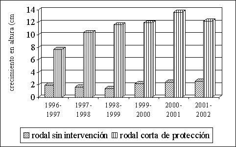 Fig. 3. Incrementos anuales en la altura de la regeneración en dos rodales de rodales Nothofagus pumilio durante 1996-2002.