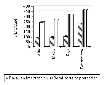 Los valores promedios de las variables medidas, por temporada y para el período analizado (Tabla 1), indican que el cambio de estructura ocasionado por la corta de protección da lugar a cambios estadísticamente significativos en la mayoría de las variables consideradas. Las diferencias más notorias correspondieron a la radiación solar global, la velocidad media del viento, las cuales superan a las del rodal no intervenido en 4 y 2 veces respectivamente. La PAR acumulada en el período de crecimiento vegetativo 2001 - 2002 (Figura 7) presentó montos 1,7 a 3,0 veces superiores en el sector con corta de protección. En los dos rodales hubo diferencias entre los tipos de cobertura considerados, apreciándose una clara tendencia a los aumentos en los flujos de radiación al reducirse la cobertura del dosel.