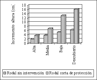 Fig. 8. Incrementos promedio en altura, por tipos de cobertura del estrato arbóreo, en 2 rodales de N.. pumilio.
