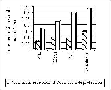 Fig. 9. Incrementos en diámetro de cuello, por tipos de cobertura del estrato arbóreo en 2 rodales de N. pumilio.