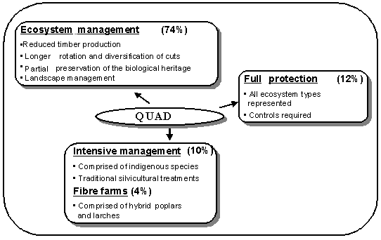 The TRIAD (Hunter 1990) principle is an interesting concept that can help in promoting sustainable management. This principle incorporates the first two conservation concepts discussed above, namely ecosystem management and full protection, while pursuing the objective of production. More concretely, this principle is based on a scenario whereby the forest area is divided into different management areas, each having a different set of goals and objectives. To better illustrate the concept, we provide an example on how the forest of Canada could be divided where the ecosystem management approach could be applied on 74% of the forest area, while 12% would receive full protection and the last 14% would be devoted to intensive management. Of this 14%, Messier and Kneeshaw (1999) advocated to divide it into intensive management, using traditional silvicultural techniques, and super-intensive management, using more productive exotic and hybrid species (QUAD) (Figure 1).