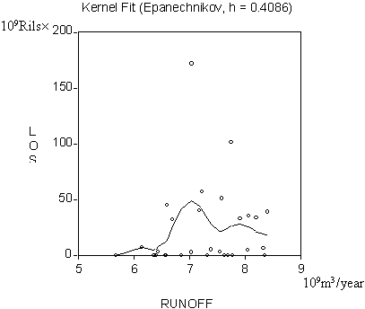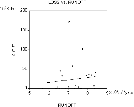 Equation (8) shows that if bm > 0 then the magnitude of the marginal effect of additional forest cover on steady state level of runoff depends on the level of forest cover- it increases with the size of forest cover. The marginal effect will ultimately become positive even if it is initially negative. This long run effect of C* on F* should not be confused with the effect of increase in cover (Ct) on Ft in the short run which is unambiguously negative and given by equation (6).The relation between the steady state values of forest cover C* and the annual runoff (F*) is shown in Fig. (1). When the annual runoff (F*) exceed the critical level F~ there will be floods and consequent economic loss. The critical level F~ is determined by the carrying capacity of the drainage system in the region and can only be enhanced in the long run by long-term investment in public works for drainage system improvement. Fig.2 depicts the relationship between forest cover and rainfall in northern Iran. The relationship is seen to be quite week. This may be also due to the fact that rainfall is a function not only of forest cover in northern Iran but depends upon many other global factors. Fig. 3 depicts linear regression fit of the relationship between runoff and forest cover in northern Iran. The fit is not very good. The relationship appears to be nonlinear as is evident from Fig.5 which depicts results of non-parametric kernel estimation. This relationship needs to be investigated with more detailed data from other locations. Fig.4 depicts the positive relationship between economic loss due to flood etc. and the runoff level.