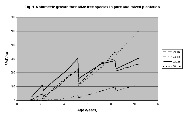 In Plantation 1, at 10 years of age, mixed-species plantations had the highest productivity of volume, statistically superior to pure-species plantations. This high productivity was directly related to the higher number of trees per hectare and to good height and diameter growth of trees on mixed-species plantations. Among the pure-species plantations, the highest growth recorded was for Vochysia guatemalensis and Jacaranda copaia. (Fig. 1). In Plantation 2, Virola koschnyi, Terminalia amazonia and mixed-species plantations had highest increment in volume. Plots with highest productivity at 9 years on plantation 3 were Vochysia ferruginea, followed by the mixed-species plantations, Balizia elegans, Hieronyma alchorneoides and Genipa americana (Piotto et al. 2002 b).