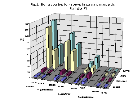 Measurements of biomass from thinnings at 6 years of age on Plantation 1 showed that pure plantations of Vochysia guatemalensis had highest biomass (91.2 Mg ha-1), followed by the mixed-species plantation (90.1 Mg ha-1), Jacaranda copaia and Calophyllum brasiliensis (Fig. 2) (Shepherd and Montagnini 2001).