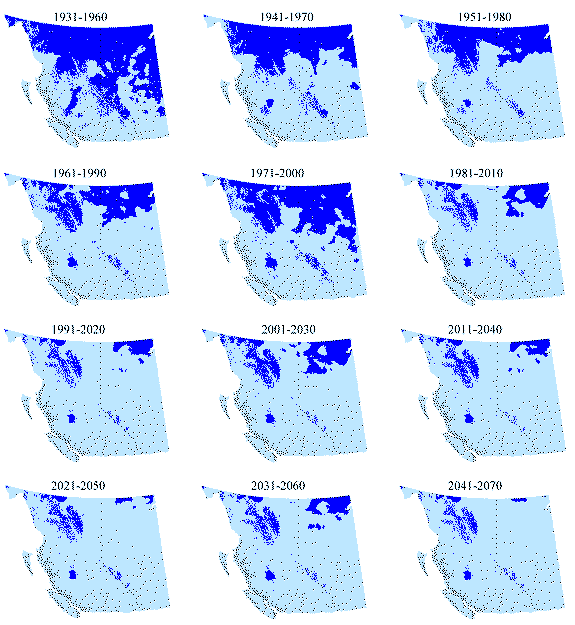Figure 1. Distribution of average winter extreme minimum temperature in British Columbia and Alberta under a plausible climate change scenario. Dark blue area: minimum temperature < -40_C. Pale blue: minimum temperature > -40_C. Points: normal-generating weather stations.