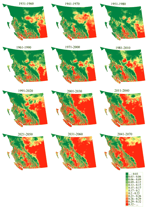 The MPB infestation risk model predicts an overall increase in the area infested by MPB, with a clear northward expansion of high risk climates, as winter minima warm up and precipitation decreases over much of the area (Fig. 2). The MPB seasonality model predicts a gradual northward shift in the insect's most suitable range in British Columbia and Alberta. The model also predicts a gradual restriction of the MPB to higher elevations and northern sections as the insect is increasingly forced into incomplete multivoltinism by the warming climate of the area (Fig. 3). However, direct temperature control of seasonality (no diapause) involves regional populations that are selected for regional climate (Logan and Bentz 1999), and southern populations have been shown to be adapted to warmer southern climates (Bentz et al. 2001). An alternative outcome could be a shift north of more southern populations to occupy warming, northern habitats.
