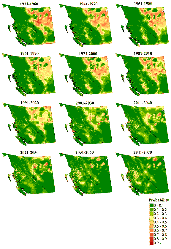 Using the MPB seasonality model, we generated a series of maps depicting the changes in probability of MPB achieving adaptive seasonality as defined by the three criteria listed earlier, as a function of climate normals at 10-year intervals from 1931-1961 to 2041-2070. Simulations were run for 500 randomly located points in British Columbia and Alberta. Universal kriging (with elevation as drift variable) was used for interpolation between simulation points. We used the same method to generate a series of maps from the output of the MPB infestation risk model.