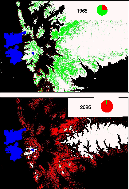 Figure 4. Expected change in the overlap between the distributions of susceptible deciduous forest (oak and aspen) and gypsy moth between 1965 and 2085 as a result of climate change in the Wasatch Mountains, east of Salt Lake City, Utah. Area in blue: city limits. Area in black: probability of GM establishment > 0.5. Area in white: probability of GM establishment < 0.5. Area in red: susceptible forest overlapping with high GM establishment probability. Area in green: susceptible forest not overlapping with high GM establishment probability.