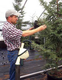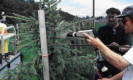 Photo 2: Pollinisation de masse dans un verger à graines à laide du pistolet électrostatique. (photo: S. Mercier, MRNQ)