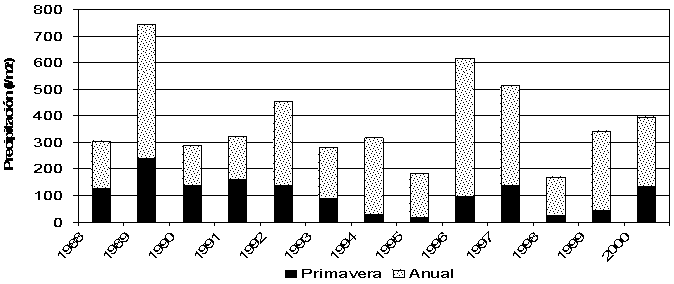 Figura 1. Precipitación anual (barra punteada) y primaveral (barra sólida), de cada uno de los años en los que ha estado la repoblación instalada en el campo, expresándose en l/m2.