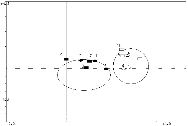 Figura 4. Representación de las doce parcelas de vegetación tras el Análisis de Correspondencias por Reescalado a lo largo de los dos ejes principales de distribución, mostrándose dentro de círculos las parcelas más relacionadas. Los símbolos sólidos son de parcelas de umbría mientras que los vacíos son de parcelas de solana, del mismo modo los ovalados son banquetas con microcuencas y los rectangulares son banquetas sin microcuencas.