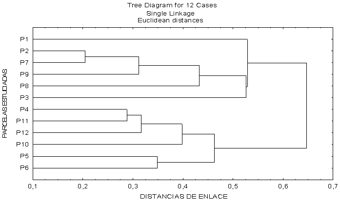 La observación del diagrama de jerarquización nos confirma que la diferencia radica en la solana y la umbría, separándose las seis parcelas de solana (parcelas 4,5,6,10,11 y 12) de las seis de umbría (parcelas 1,2,3,7,8 y 9) en la primera división del análisis.