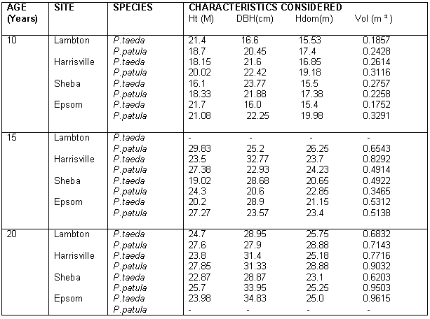The growth performance of the two species, P.taeda and P.patula, though indicating differences across the sites tend to perform equally good in the Penhalonga region. P.patula tends to increase much more in height as it reaches fifteen years and at the same time P.taeda significantly gains in diameter. The two species at the end of twenty years still manifest this trend, though P.patula starts to increase in diameter as well, showing a significant increase (0.01) of this parameter. Since the industry is concerned much more about volume, the two species do not significantly vary in volume; because the height of P.patula is compensated by diameter growth in P.taeda. Environmental conditions in this region tend to be similar across the sites. This might be because of the little variation in altitude, rainfall, parent rock and soil type and to some extent the effective rooting depth. (ERD).