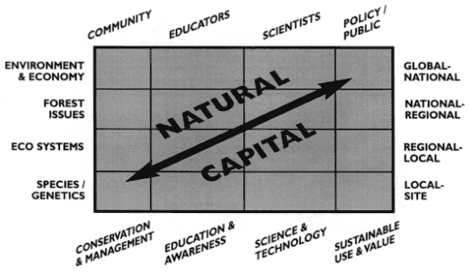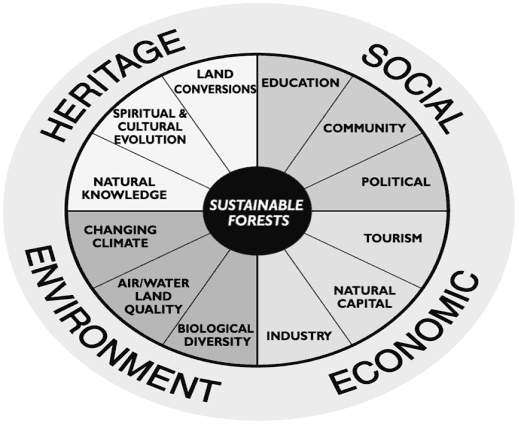 When adaptive management first entered the vocabulary of forest management, it heralded a new way of thinking in which management policies were treated as experiments, learning from them and using them as a basis for changes and adjustments (Stankey, 2001). If we characterize current forest biodiversity management policies within the overarching theme of natural capital, then Figure 3 provides some insight into the multiplicity of goals, values and life services managed by many groups worldwide. Trees and forests are more than wood. In many communities they are the source of heat, food, shelter, and spiritual value. In others, they are the industrial forest, to others a habitat rich in biodiversity and to others a regulating influence on the atmosphere. The majority of forests worldwide continue to be natural and managed accordingly. But if we accept that humanity has created this third "outrage" on the world, then this graphical depiction quickly turns from a theme of viewing forests as natural capital to one of managed values for sustainability, by which all forests will be managed for a diversity of targets within the envelope of global climate change. This management of multi-taxa is the real challenge facing forest managers. Adaptive approaches offer hope for the successful management of natural-origin and planted forests for their multiplicity of values, but driven and defined at the local levels within a global climate change envelope.