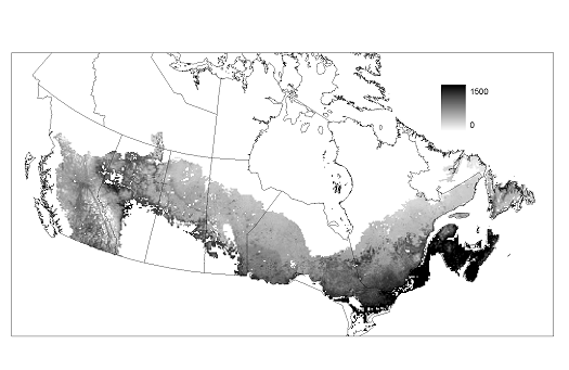 Fig. 3: Map of net primary productivity (g m-2 y-1) across Canada's boreal forest derived from 1994 forest cover and climate information.