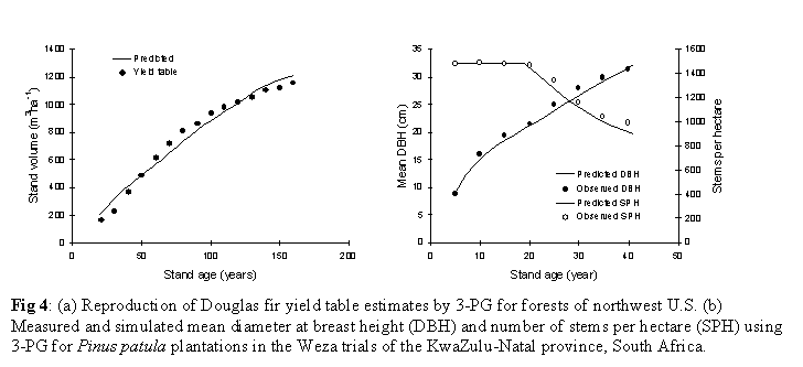The 3-PG model was assessed for its ability to predict growth and water use of Pinus patula at four test sites located in Swaziland, and in the provinces of Mpumalamga, KwaZulu-Natal, and North-east Cape. Model parameter values were determined from available field data, reported data for other species of pines, or as a result of a fitting process to match simulated to observed patterns of growth and water use in four diverse stands of this species. Simulation results were very encouraging (Fig. 4b), and a further phase of model testing on a wider range of test sites is being pursued to improve parameter estimates and demonstrate the usefulness of the model.
