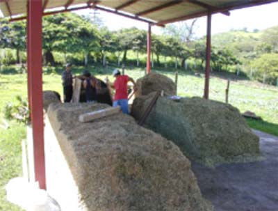 La biomasa obtenida de las especies arbóreas es triturada a través de una máquina desfibradora para obtener dimensión adecuada partícula (Foto 1). Aquí, se utilizaron ramas verdes de hasta cinco centímetro de diámetro. Seguidamente se forman las pilas de dimensión de 1.5 m ancho * 1.5 m altura para favorecer la oxigenación natural. La biomasa picada se deposita sobre un piso de concreto (Foto 2), esta no tiene que hacer contacto con tierra. Diariamente se tomó la temperatura de las pilas que sirve de indicador para conocer el momento apropiado para la remoción de la pila y permitir un buen compostaje.