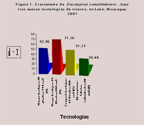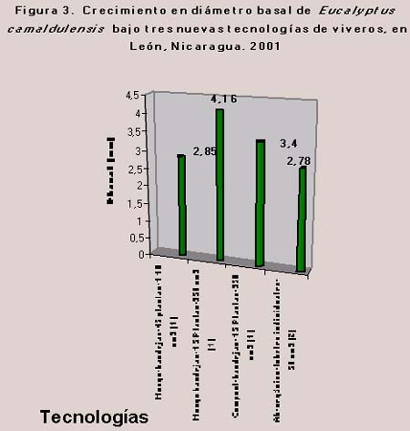 Se realizó una evaluación preliminar sobre el estándar de calidad de plantas de Eucalyptus camaldulensis (eucalipto) y Tabebuia rosea (roble macuelizo) producidas bajo los tres tipos de nueva tecnologías de viveros en León. Los parámetros considerados sobre el crecimiento fueron la altura y el diámetro basal, se evaluaron 25 plantas por tecnología y se diseñó un formato de campo.