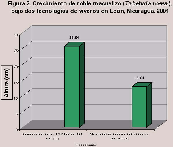 El crecimiento de Tabebuia rosea (roble-macuelizo) se comparó con la tecnología del compost y la tecnología de PROLEÑA. Aquí, se encontró un mejor crecimiento en altura con el compost, el cual presentó un promedio de 25.6 cm y la tecnología de PROLEÑA con el nivel más bajo de 12.8 cm de altura (Figura 2).
