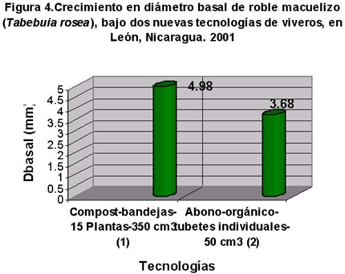 El crecimiento de Tabebuia rosea (roble) se comparó con la tecnología del compost y la tecnología de PROLEÑA. También se encontró un mejor crecimiento en diámetro basal con el compost, el cual presentó un promedio de 5.0 mm, y la tecnología de PROLEÑA obtuvo el menor crecimiento de 3.7 mm.(Figura 4)