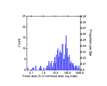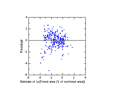 The frequency distribution of our dependent variable - forest area as a percentage of nonforest area - is not deviating too much from the normal distribution (Figure 1). The residuals of our modeling of Table 1 are plotted against model estimates (Figure 2). Only a few outlying residuals are deviating outside the length of the whole range of estimates, therefore we consider the variance of the residual distribution is not too wide and, on the other hand, the distribution has no systematic biases. The two qualitative evaluations (Figures 1-2) seem to support the application of our function form and ordinary least squares estimation method (OLS).