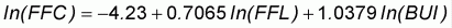To relate fuel characteristics to fuel consumption, the relationship between FFC and slash fuel characteristics was determined by multiple linear regression. Of the fuel characteristics, forest floor loading (FFL) and the BUI were used as the independent variables and FFC as the dependent variable. The examination of the residuals vs. predicted FFC indicated a non-homogeneity across the range of the data. Thus, a log-transformation of the data was performed. Then, a multiple linear regression analysis was carried out on the log-transformed data. Dominant factors influencing fuel consumption were the forest floor loading (FFL) and the BUI, accounting for 79% of the observed variation (P<0.01) (Fig. 2).