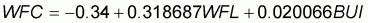 As for the relationship between WFC and fuel characteristics, the same analysis technique was applied. WFL and the BUI were used as independent variables, and WFC as dependent variable. The relationship was found to be significant with the variables included, contributing significantly and explaining 69% of the variation (P<0.001) (Eq. 10) (Fig. 3).
