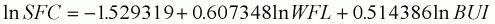 The relationship explained 86% of the observed variation. The result, in terms of percent variability explained, was far better than that for the separate relationships (i.e., FFC and WFC). Thus, only one relationship employing WFL and the BUI can be used to predict total SFC (Fig. 4).