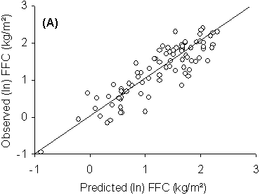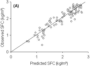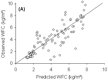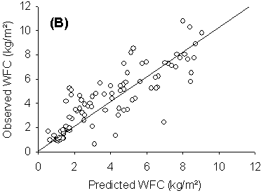 To examine the results of the analyses, equation coefficients were derived for each fire in the data set as explained above. Resultant coefficients were used in the FFC and WFC equations to generate fuel consumption for each fire. Fig. 5 is the graph of predicted FFC vs. observed FFC (A), and predicted WFC vs. observed WFC (B) for slash fuels.