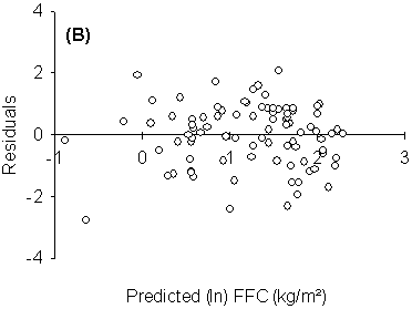 Fig. 2. Relationship between the predicted and the observed (ln) FFC for slash fuels (A), and residuals for the regression of A (B).