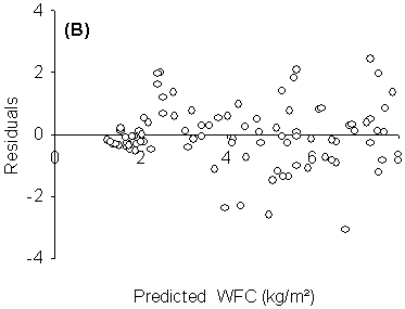 Fig. 3. Relationship between the predicted and the observed WFC for slash fuels (A), and residuals for the regression of A (B).