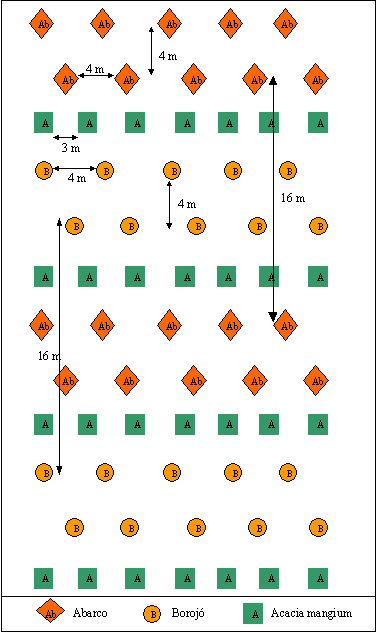 El modelo estaría distribuido en fajas, de dos hileras para abarco y borojó, las cuales se encuentran separadas por una hilera de acacia mangium, dando como resultado 10 hileras/Ha para cada especie. La distancia de siembra para borojó es 4 × 4 m (doble hilera) y 16 m entre doble hilera (densidad de 240 plantas/Ha), para abarco de 4 × 4 m (doble hilera) y 16 m entre doble hilera (densidad de 240 plantas/Ha), y acacia mangium se encuentra intercalada entre las fajas de abarco y borojó, con una distancia de siembra de 3 × 3 m (densidad de 320 plantas/Ha). Entre las hileras de borojó se pueden establecer cultivos agrícolas de pancoger, como arroz (Oryza sativa), maíz (Zea mays), sorgo (Sorghum spp.), caña de azúcar (Saccharum officinarum), ajonjolí (Sesamum indicum), piña (Ananas spp.), plátano (Musa spp.), yuca (Manihot esculenta) y soya (Glycine soja ) (Figura 1).