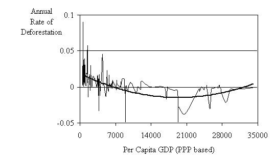 The relationship between development (as represented by per capita income) and the rate of deforestation is expected to reveal the existence of an environmental Kuznets curve (EKC). The basic idea underlying the EKC applied to deforestation is as follows: a very poor country has a relatively low rate of deforestation because it lacks the resources to undertake large-scale logging operations, but as income rises, deforestation rates may initially rise as forest exploitation aids economic development. As income continues to grow and more environmental amenities are demanded, a point is reached where further increases in income lead to reduced rates of deforestation, or even reforestation to correct earlier damage (Bhattarai and Hammig 2001). An EKC relation is found if the sign on the per capita GDP variable is negative, and that on GDP-squared is positive with both parameters being statistically significant. The consequent shape of the EKC is a U.