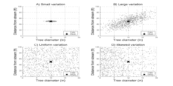 Though simulated, the data in Figure 1 are representative of conditions that may occur in forested riparian zones. The small variation case (A) could represent the migration of a stream channel to a position approximately 50 feet from a very uniform stand, for example a plantation. The large variation case (B) could represent a forest stand composed of young, small trees that have seeded in near a stream channel that is migrating away from older, larger trees that may have been adjacent to the stream at one time. The uniform variation case (C) could represent a mixed species, multi-aged stand that is just entering stand differentiation. Finally, the skewed variation case (D) could represent a forest stand after multiple disturbances, such as fire, landslide, or stream channel migration, having a large component of young, small trees that began growing after the most recent disturbance and older, larger trees that have survived one or more disturbances.